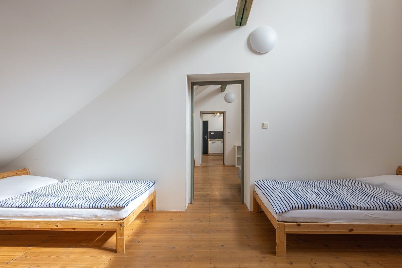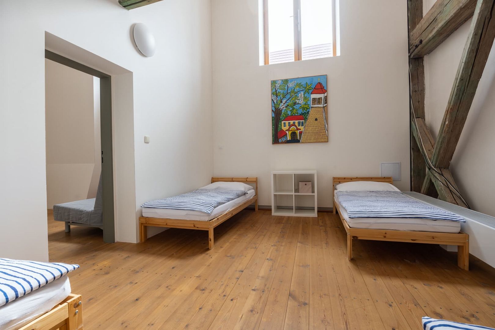 The bright and spacious accommodation is located on the second floor and has its own bathroom. There are three passage rooms. In the first room there is a kitchenette with a dining area, in the second room 2 twin beds and in the third room four twin beds. Internet connection is free of charge.